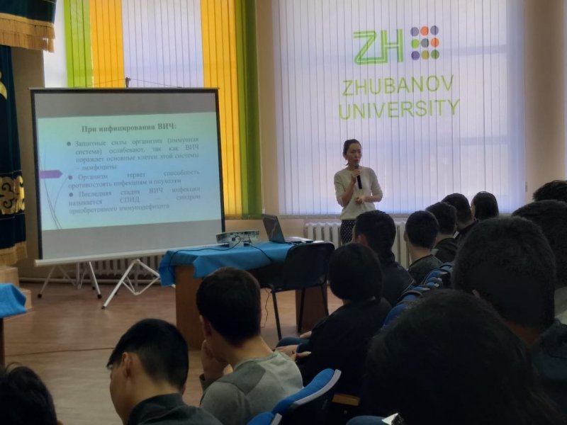 Дүниежүзілік ЖИТС-ке қарсы күрес кампаниясы аясында Қ.Жұбанов атындағы «АИТВ-жұқпасының алдын алу» тақырыбында тарих факультетінің бірінші және екінші курс студенттеріне дәріс өтті. Дәрісті ЖИТС орталығының әлеуметтанушы С.Мұханбетжанова жүргізді. Дәріс барысында жастар арасындағы АИТВ-жұқпасының берілу жолдары, диагностика, және алдын алу іс-шаралары талқыланды. Әлеуметтанушы стигма мен кемсітушілікке ерекше көңіл бөлді. Ол сондай-ақ студенттерді облысымыздың эпидемиологиялық жағдайымен таныстырып және ЖИТС орталықтың достық кабинетінің жұмысы туралы әңгімеледі. Дәрістің соңында бейнероликтер көрсетіліп, ақпараттық оқу материалдары таратылды.
