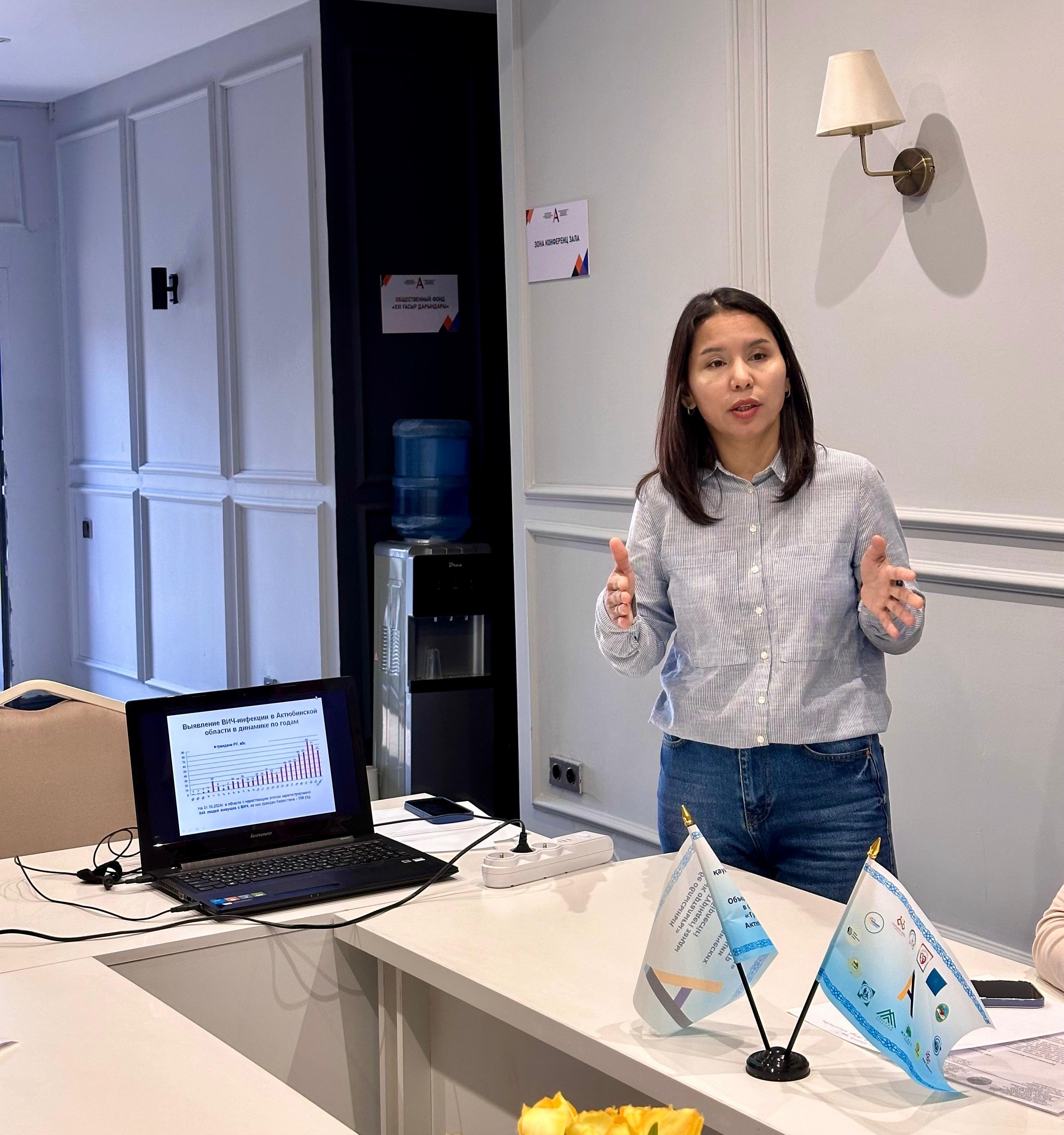 Презентациямен профилактикалық бөлім меңгерушісі Айжан Жайлаубаева сөз сөйлеп, жалпы облыстағы АИТВ-инфекциясы бойынша эпидемиологиялық жағдайды және Дүниежүзілік ЖИТС-ке қарсы күрес күні аясында бірлескен алдын алу іс-шараларын өткізу жоспарлары туралы айтып берді.