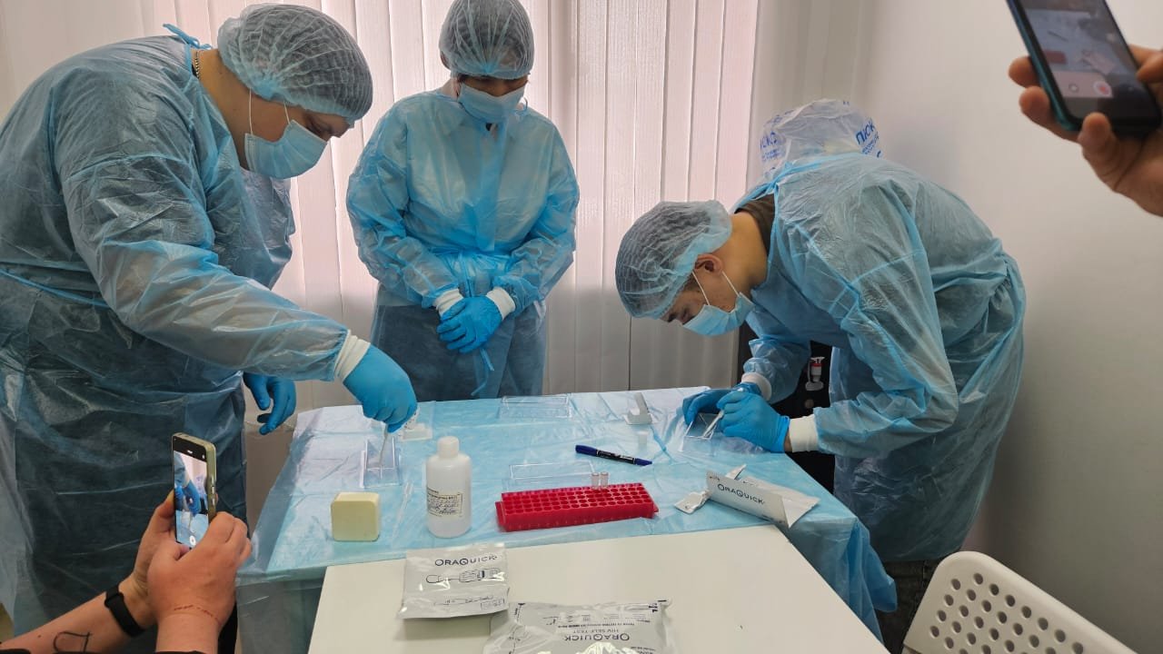 Іс-шара барысында АИТВ-ға тестілеуді жүргізу бойынша тренинг сабағы өтті, онда биоматериал (ұңғыма сұйықтығы) жинау, OraQuick АИТВ-ға жедел тестін өткізу әдістемесі және сыртқы сапаны бағалау бойынша практикалық дағдылар әзірленді. АИТВ-ға жедел тестілеу сапасын бағалау үшін пробиркалардағы кептірілген үлгілер пайдаланылды, оның үшеуі оң, біреуі теріс болды. Нәтижелері бойынша тестілеу алаңдарына баға берілді, экспресс-тестілеу саласында жұмыс істеу әдістемесі және жұмыстың қолайлылық критерийлері талқыланды.