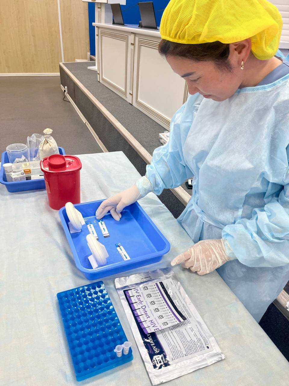 ЖИТС орталығының зертхана меңгерушісі Гүлмира Қульжанова экспресс-тесттерді қолдану бойынша оқыту жүргізіп, тәжірибесімен бөлісті.