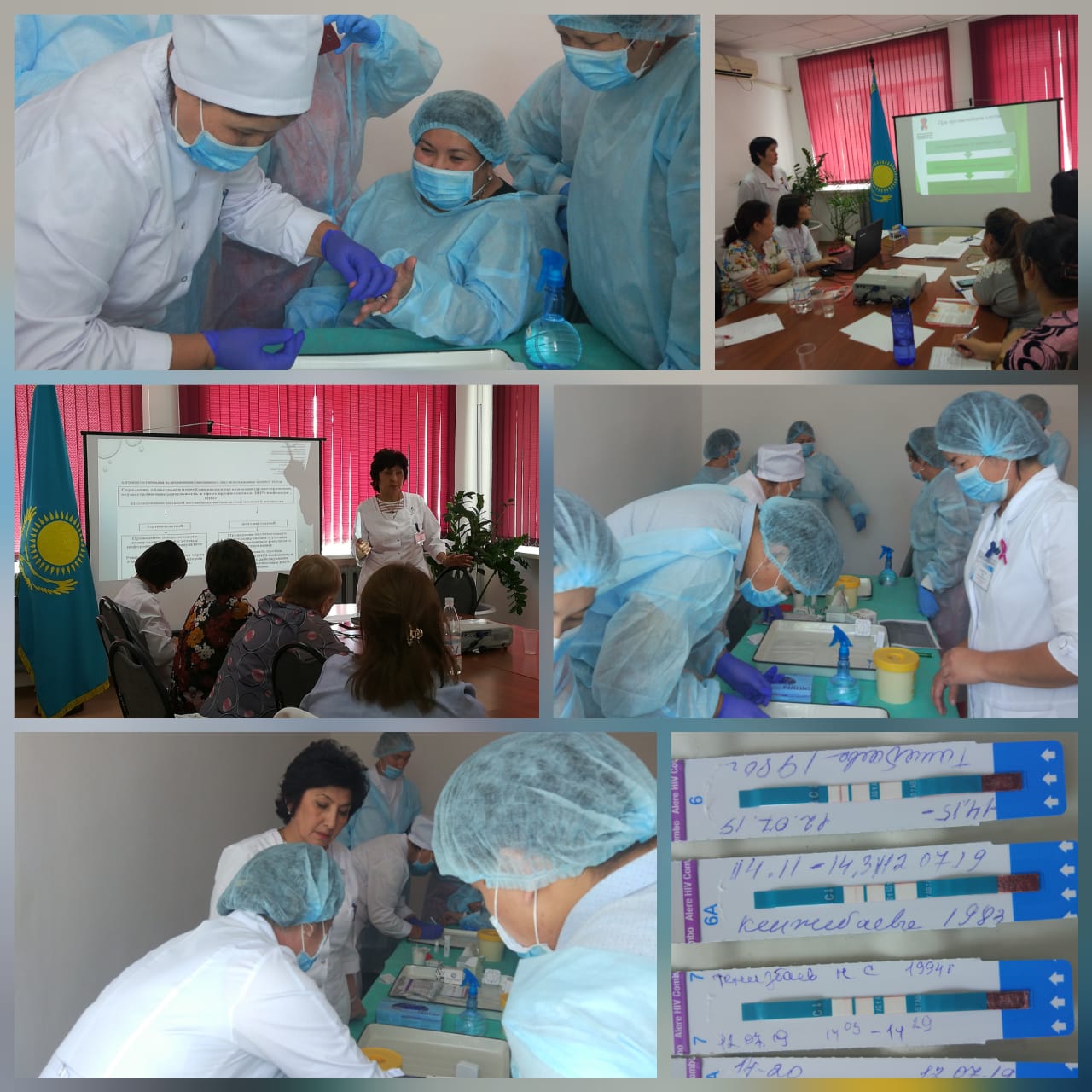 2019 ж. 10-12 шілде аралығында Ақтөбе қ. ЖИТС орталығы зертханасының мамандары АИТВ экспресс-тестілеу сапасын сыртқы бағалауды енгізу шеңберінде БМСК, жеке МҰ, стационарлар мен аудандық ауруханаларда АИТВ және ЖИТС алдын алу бөліміне жауапты дәрігерлер үшін тренингтер өткізді.